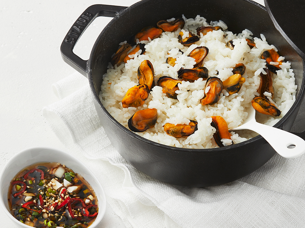 한 번 더 세척 후 손질한 홍합살을 솥밥 위에 올린 후 약 10분간 끓여주면 홍합 솥밥이 완성됩니다. 고추, 간장을 넣어 만든 양념장을 곁들이면 더욱 맛있어요.