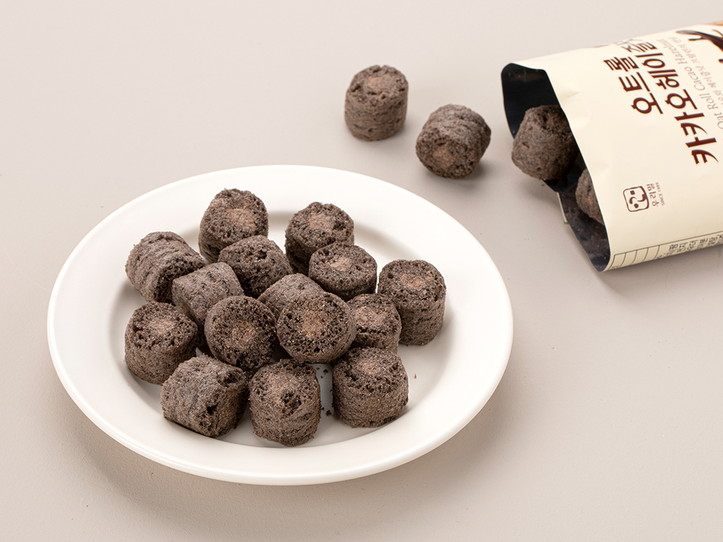 간편하지만 고급스럽게 즐기는 초콜릿 디저트, 오트롤 카카오헤이즐넛을 만나보세요. 국내산 5곡을 튀기지 않고 담백하게 구워낸 과자랍니다. 프랑스 초콜릿 명가 발로나의 헤이즐넛 프랄린과 벨기에 프리미엄 카카오를 함께 넣었습니다. 덕분에 고소하고 진한 초콜릿 풍미를 가득 품었죠. 커피, 우유 등과 함께 간식으로 부담 없이 즐겨보세요. 부드럽고 폭신한 식감으로 아이들도 참 좋아할 거예요.