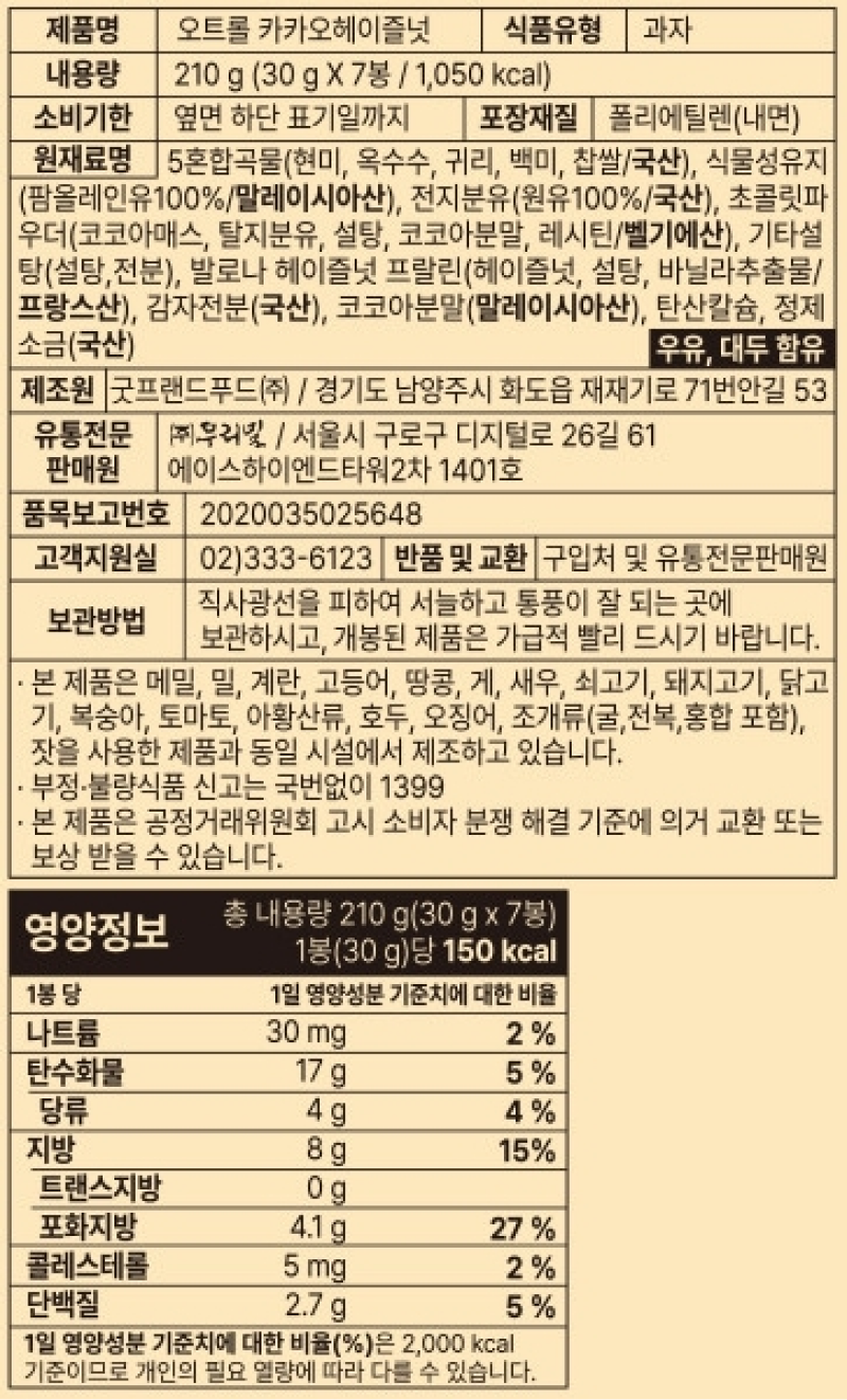 | 제품명 | 오트롤 카카오헤이즐넛(30gx7봉) |