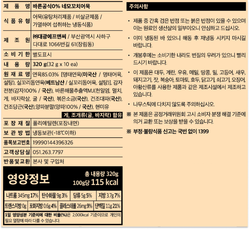 고급 명태 연육과 실꼬리돔 연육으로 밀가루 없이 바르게 만든, 그야말로 이름값 하는 꼬치 어묵입니다. 연육 함량이 무려 85% 이상이라 진하고 고소한 어묵 맛을 자랑해요. 밀가루를 사용하지 않은 글루텐 프리 제품으로 먹고 나서도 속이 편안하죠. 간편한 꼬치형 어묵이니 준비한 육수에 그대로 넣고 끓이기만 하면 됩니다. 집에서는 물론, 야외 캠핑 메뉴에 간편하게 활용해 보세요.