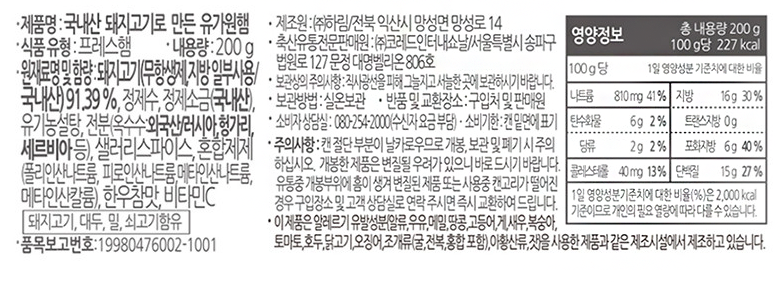 | 제품명 | 국내산 돼지고기로 만든 유가원햄(200g×4입) |